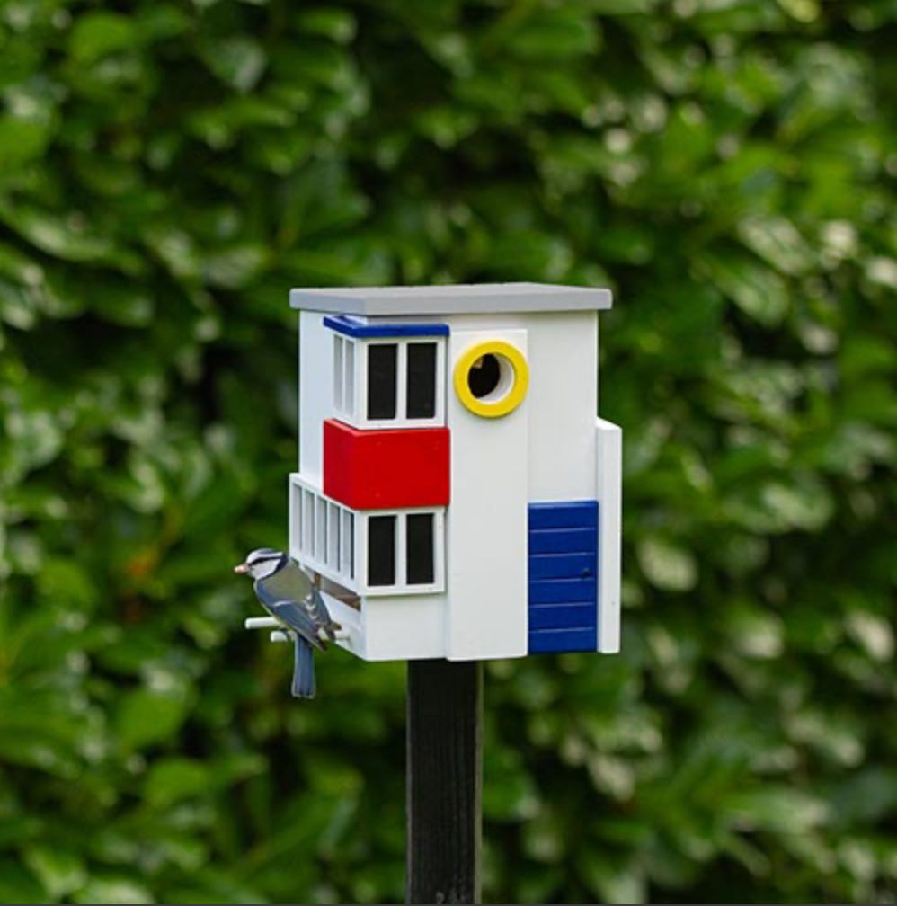 The birdhouse can be used either as a feeder or as a nesting box, depending upon the season. The house matches the style conscious home owner that can appreciate a house in the spirit of De Stijl, designed with the help of ornithologists in order to be suitable for a small bird. With its three primary colours and the horizontal and vertical geometrical shapes, the angularity of the bird house is a fun addition to the greenery of the garden.