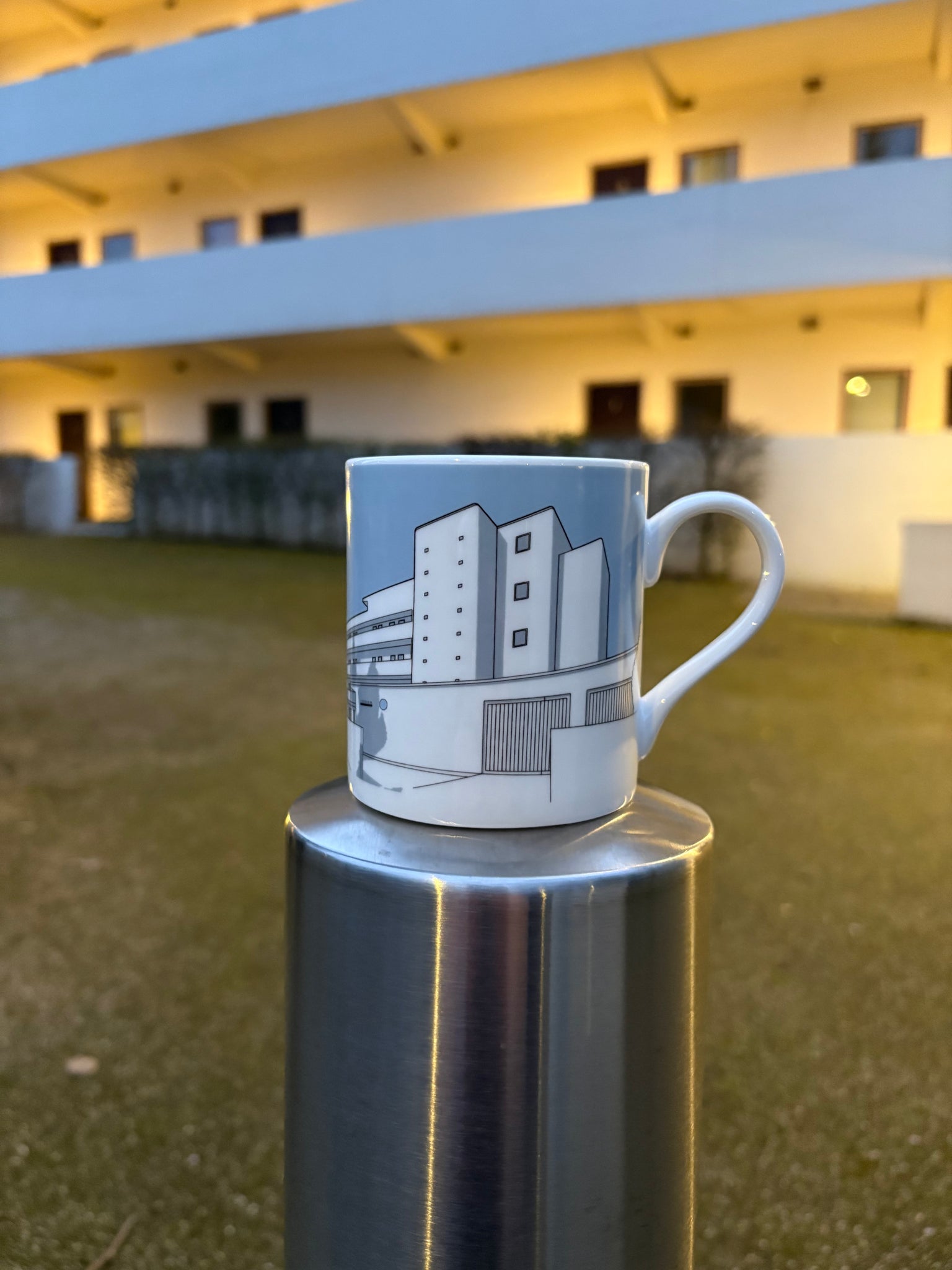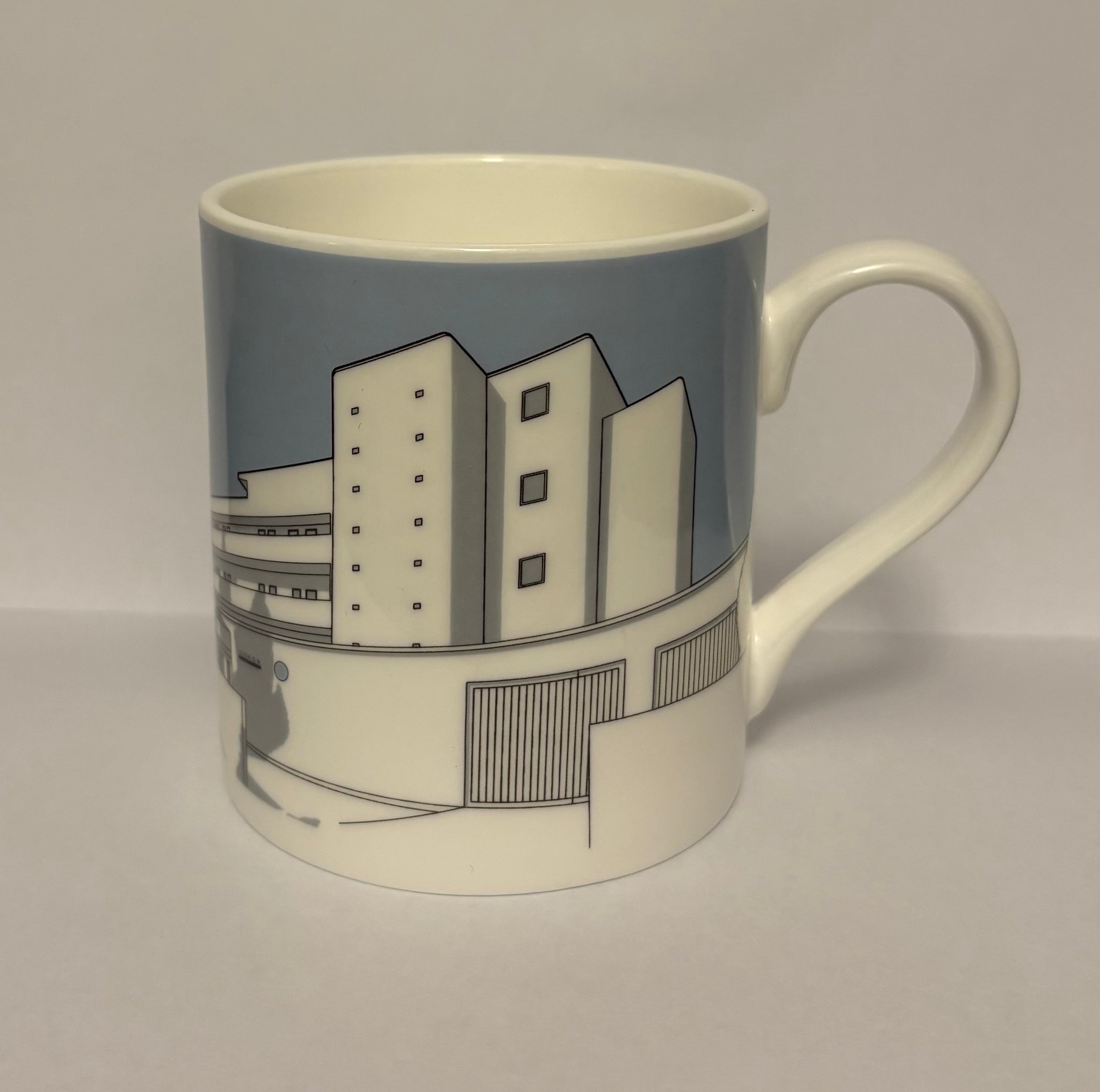 25cl bone china mug featuring Isokon from the 1930s Modernist London Homes range by People Will Always Need Plates. This is a new 2026 design in slate grey / light blue.